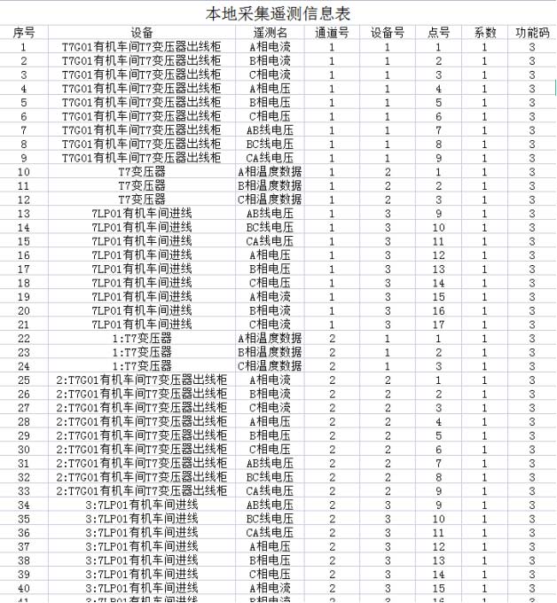 變電站綜合自動化系統需采集設備數量共計34臺,本地設備根據數據類型主要分為遙測、遙信、電能三類數據,部分數據展示如下: