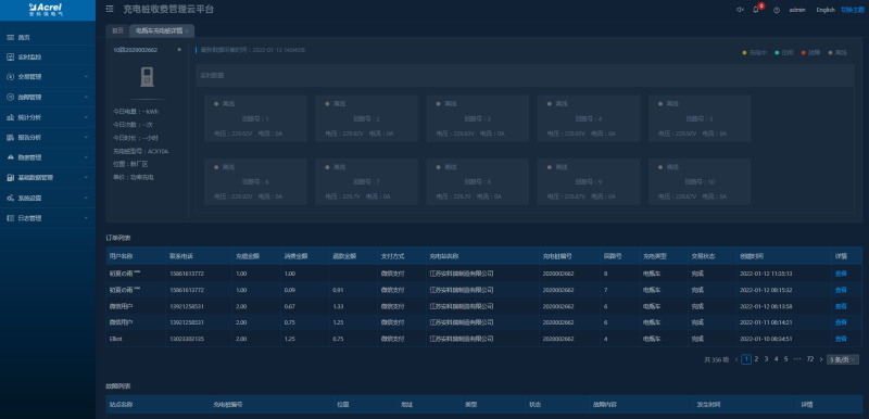 顯示充電樁各回路的狀態(tài)及充電數(shù)據(jù),統(tǒng)計充電樁今日充電數(shù)據(jù)、訂單記錄、故障信息,可以查看訂單和故障的詳情。