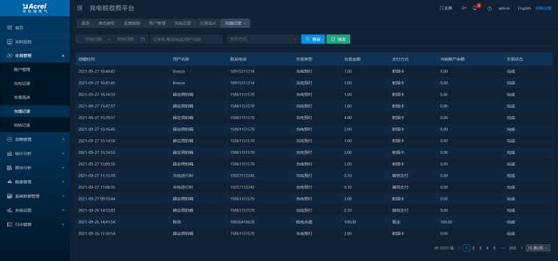 顯示所有訂單數(shù)據(jù),可以對訂單按照充電站、充電樁、支付方式、交易狀態(tài)等進行分類查詢,可對充電中的充電樁進行停止充電操作。