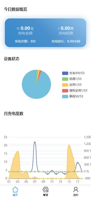 可按日、月、季度、年查看充電次數(shù)、充電時長、充電金額,同時顯示對應的曲線圖。